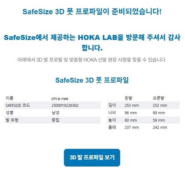 SafeSize 3D 풋 스캐닝은 단순한 신발 쇼핑을 넘어, 내 발을 이해하고 건강한 러닝 라이프를 시작하는 첫걸음이에요. 발이 편해야 하루가 즐겁죠! 저는 다른 브랜드 러닝화 혹은 신발 구매 시에도 풋 스캐닝 정보를 활용하고 있어요! 풋 스캐닝이 정말 활용도가 좋기는 하지만 러닝화건 운동화건 구두건 신발은 꼭 실제 착용을 해보시고 구매하시는 것을 추천드려요!
