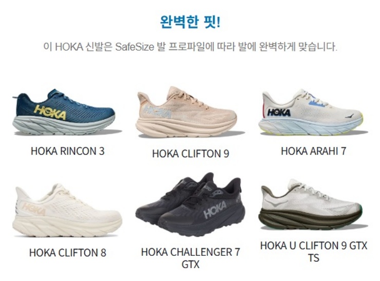 호카는 러닝화로 유명한 브랜드잖아요. 편안한 쿠셔닝과 안정적인 착용감으로 러너들 사이에서 이미 입소문 난 브랜드! 여기에 SafeSize 3D 풋 스캐닝까지 더해지니, 내 발에 맞춘 ‘맞춤형 러닝’이 가능해지는 거예요. 러닝뿐만 아니라 등산, 워킹, 일상용 신발까지 폭넓게 추천받을 수 있어서 활용도가 높아요.