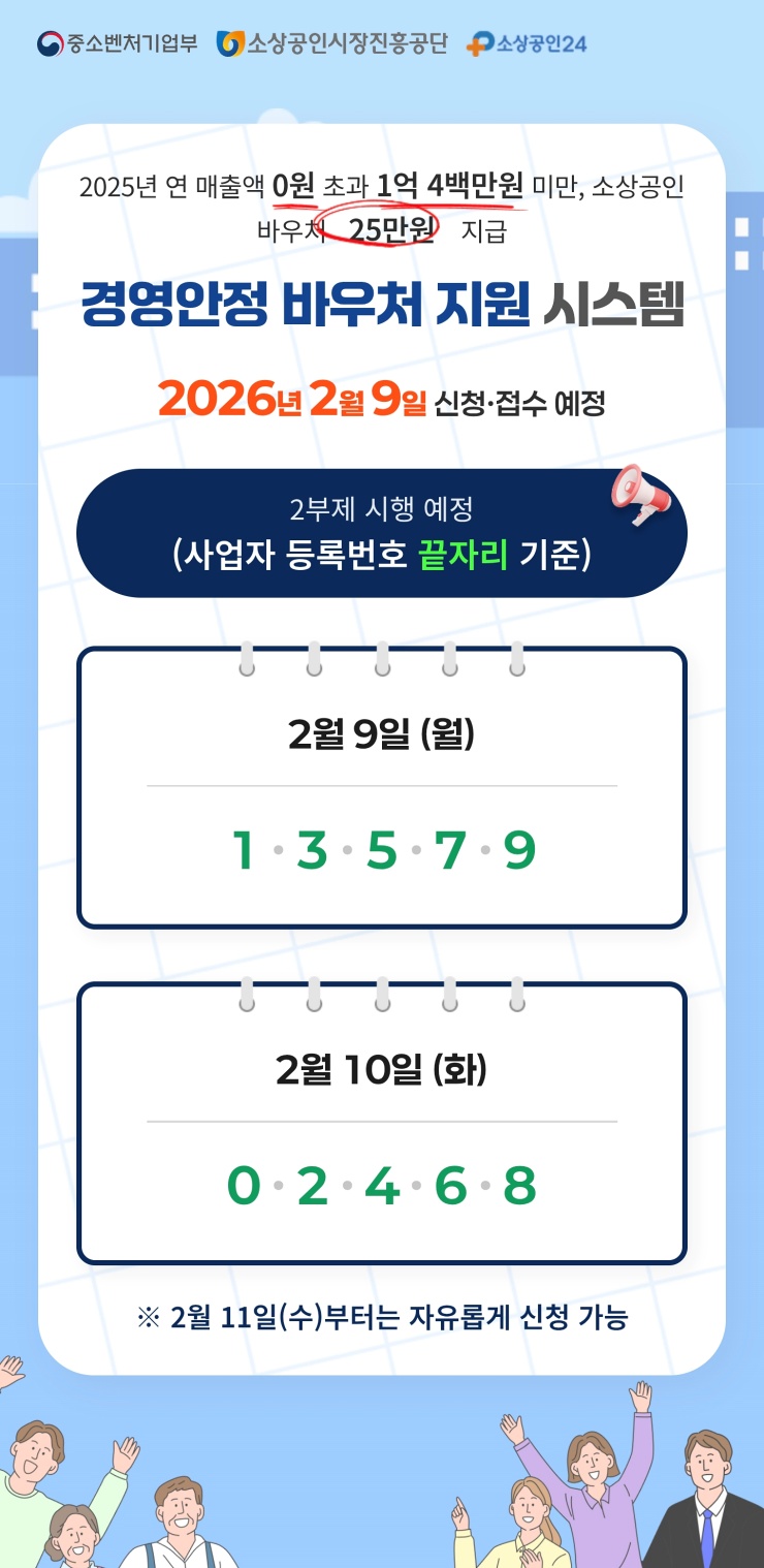 연 매출 1억 400만 원 미만 소상공인이라면 누구나 누릴 수 있는 권리인 만큼, 2월 9일(월)부터 시작되는 홀짝제 기간을 놓치지 말고 꼭 신청하시길 바랍니다.