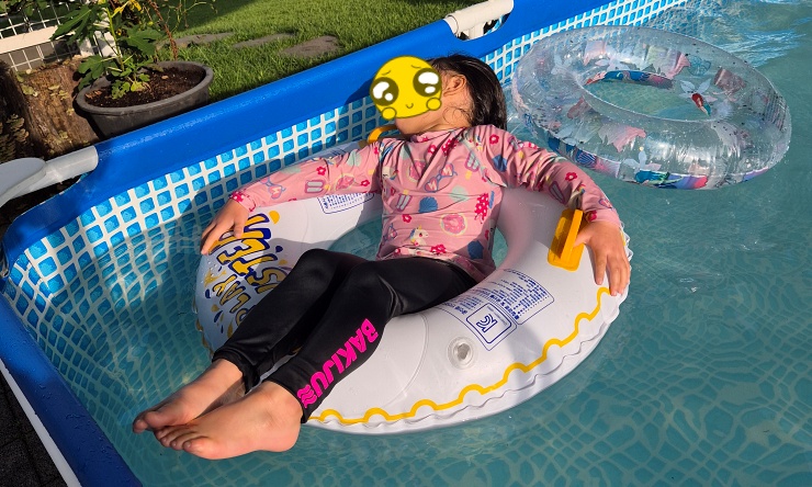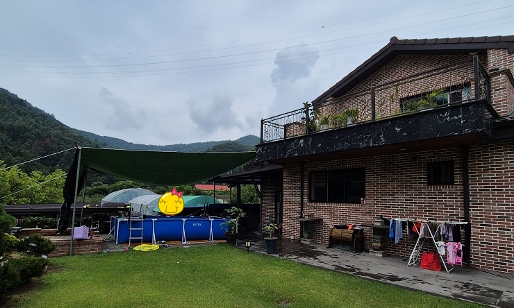 과수원의 하이라이트는 바로 앞마당 잔디밭에 설치된 간이 수영장이었어요! 수도 옆에 깔끔하게 설치되어 있어 여름철 더위 탈출에 딱이더라고요. 물이 깨끗하고 아이들이 놀기 좋은 수심으로 채워져 있어 안전했답니다.